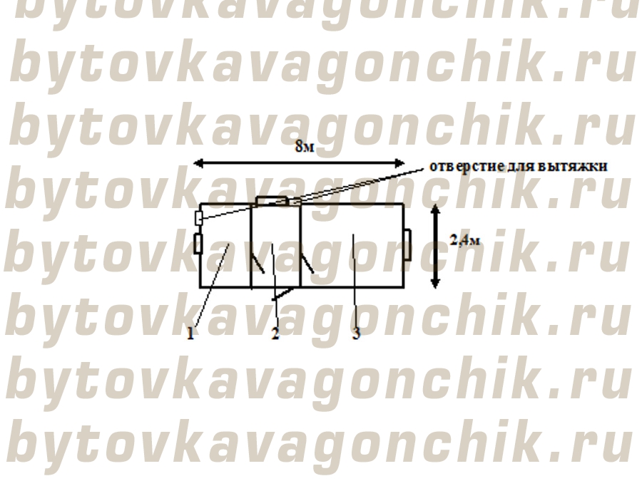 - отделка внутренняя: 1,2: стены, потолок- вагонка ПВХ белая; 3: стены- панели МДФ св.дерево, потолок- вагонка ПВХ белая;